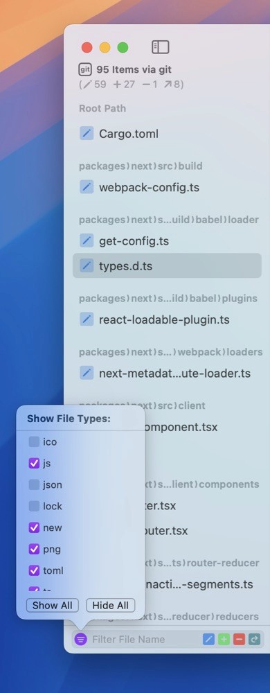 The area at the bottom offer various ways to quickly narrow down the list to what you care about. You may filter files by: