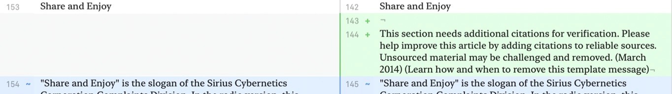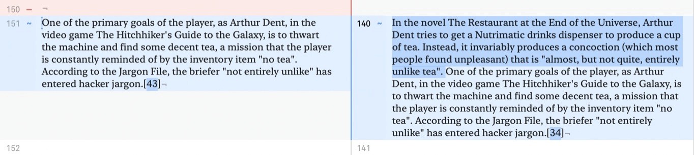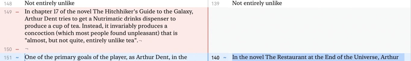 Lines with changes in them are highlighted in blue. Inside of these lines, the words that have changed are highlighted in deeper blue.