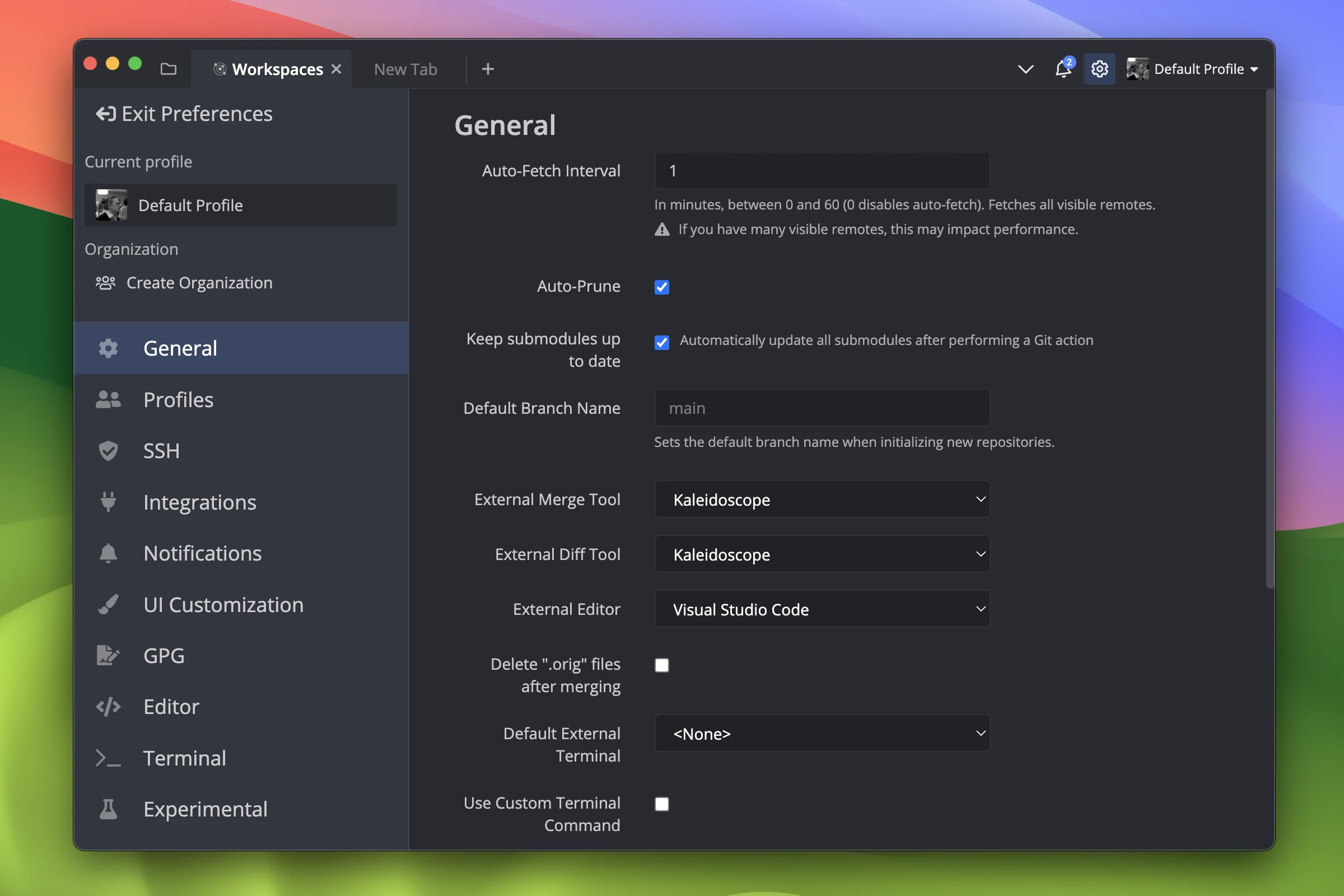 In the General section, select Kaleidoscope as External Merge Tool and External Diff Tool: