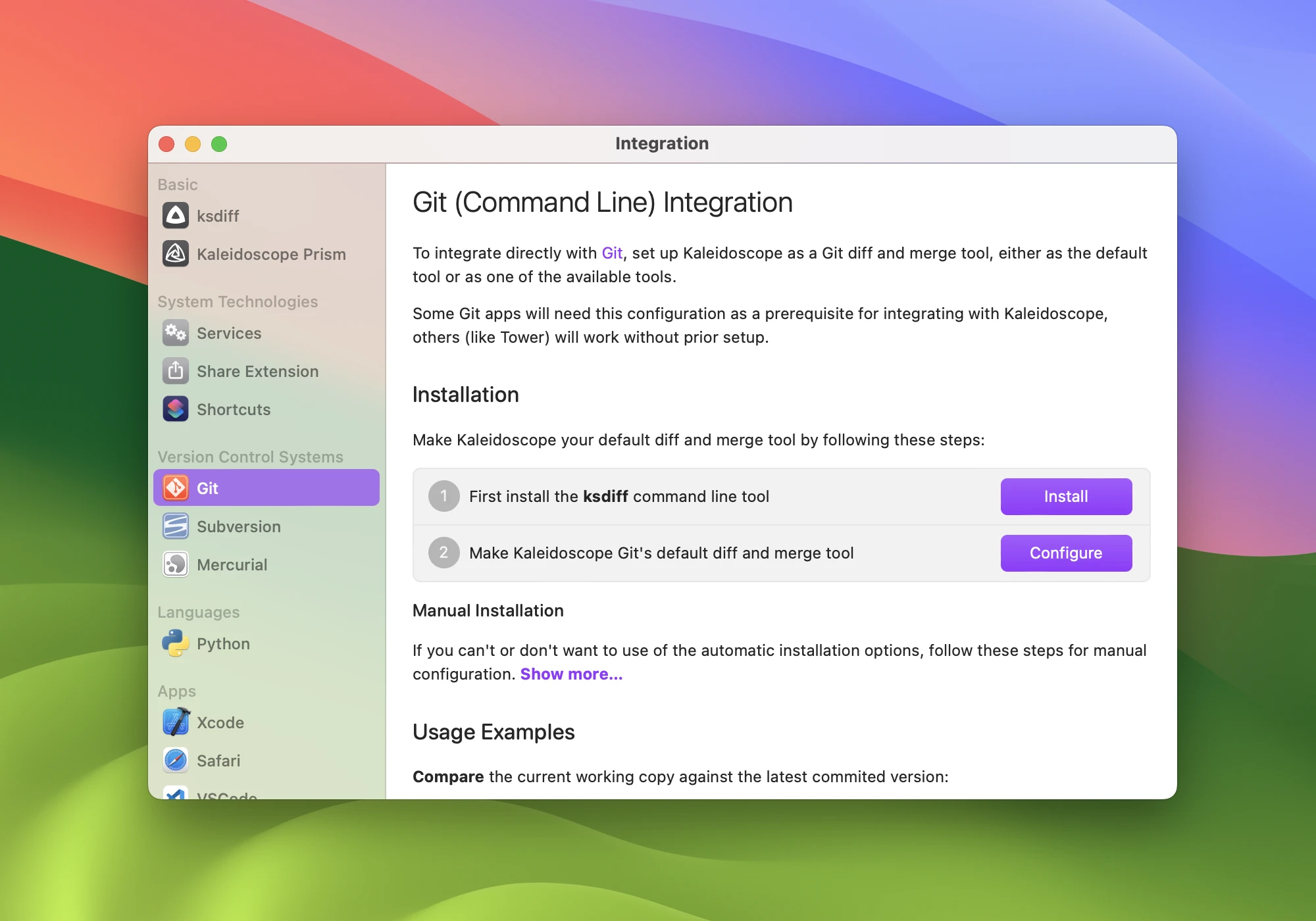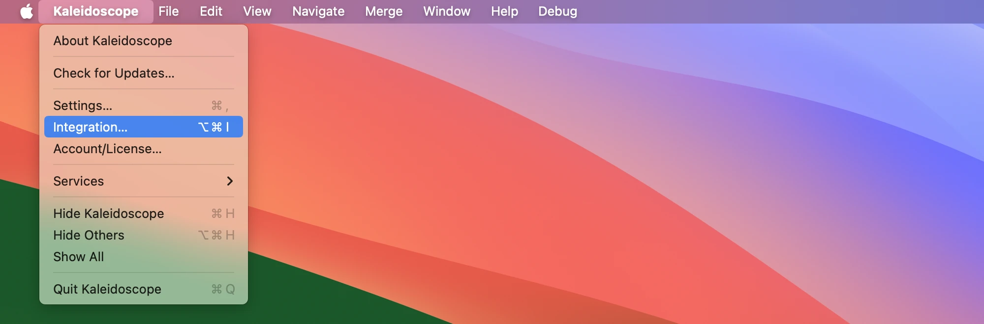 After downloading and moving Kaleidoscope into the Application folder, you are ready to configure it to work with GitKraken. Open the Integration window over Kaleidoscope application menu > Integration…