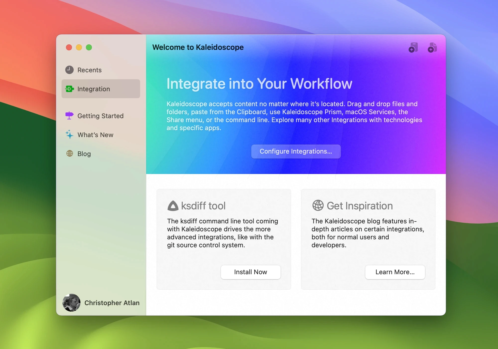 After downloading and moving Kaleidoscope into the Application folder, you are ready to configure it to work with Tower. First you need to navigate to the Integration section in the Welcome Window.