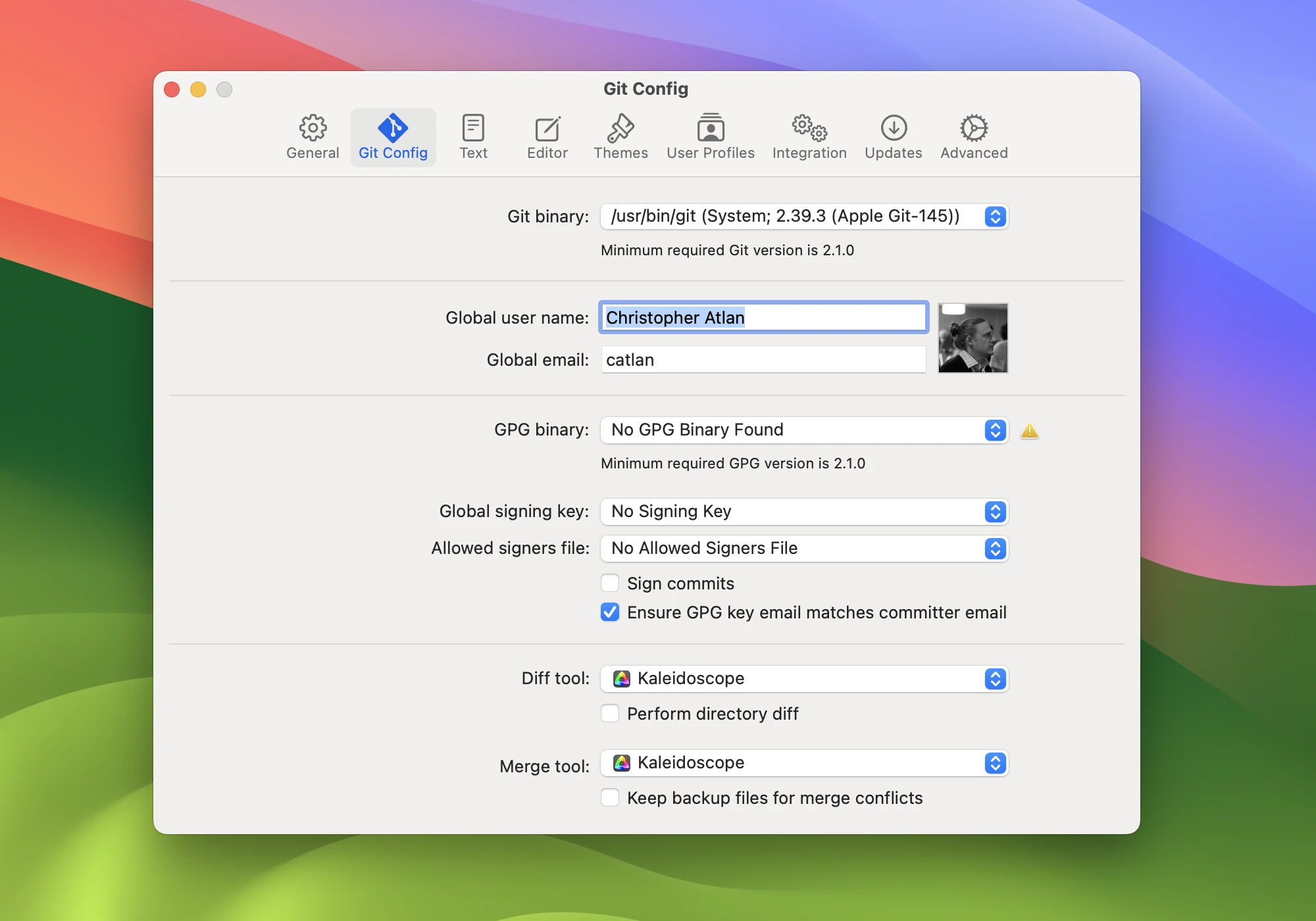 Navigate to the Git Config section. Select Kaleidoscope as Diff tool and Merge tool and make sure that "Perform directory diff" is unchecked.
